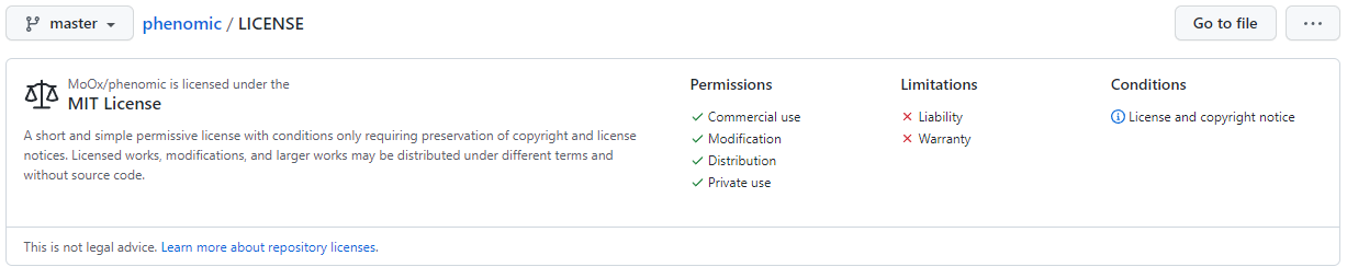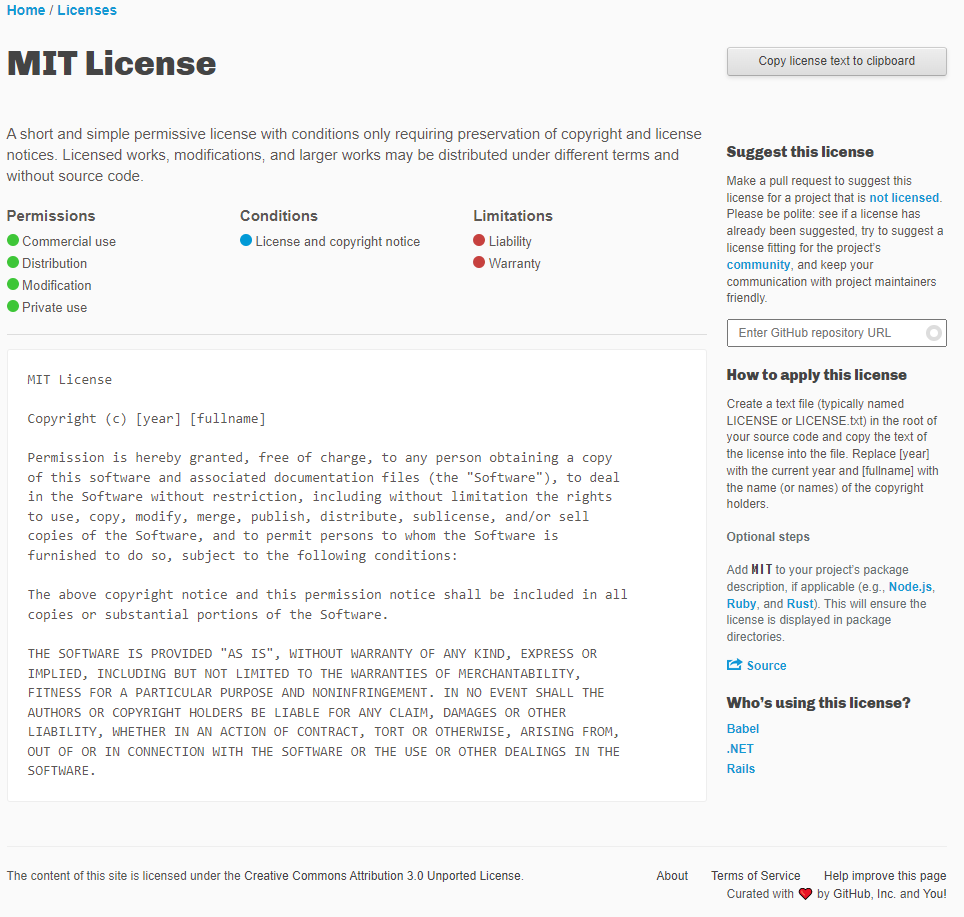 만약 원하는 license가 프리셋에 없다면 choosealicense.com 사이트를 활용하면 도움이 된다. 선택한 license 우측의 "Copy license text to clipboard" 버튼을 통해 복사 후 LICENSE 파일에 붙여넣고 commit 하면 등록 및 GitHub UI에서 인식한다. 또한, 해당 license가 적용된 repository는 GitHub의 검색필터에도 적용이 된다. (e.g. "license:mit")