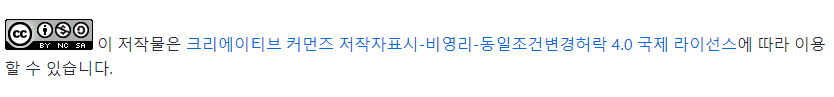 <a rel="license" href="http://creativecommons.org/licenses/by-nc-sa/4.0/"><img alt="크리에이티브 커먼즈 라이선스" style="border-width:0" src="https://i.creativecommons.org/l/by-nc-sa/4.0/88x31.png" /></a><br />이 저작물은 <a rel="license" href="http://creativecommons.org/licenses/by-nc-sa/4.0/">크리에이티브 커먼즈 저작자표시-비영리-동일조건변경허락 4.0 국제 라이선스</a>에 따라 이용할 수 있습니다.