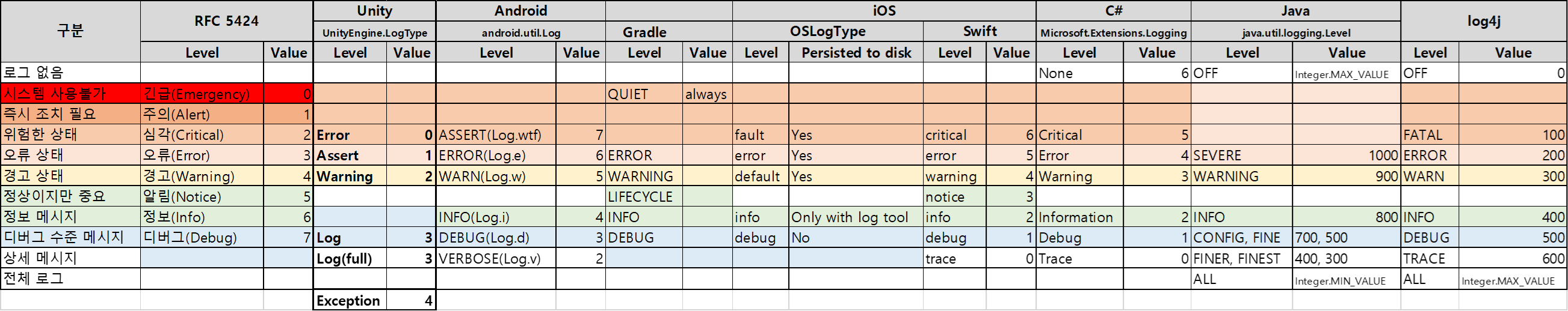 Unity의 Exception의 경우 Error수준인데 순서가 마지막에 있는걸보면 LogType은 심각도 수준 순서가 아니란걸 알 수 있다.