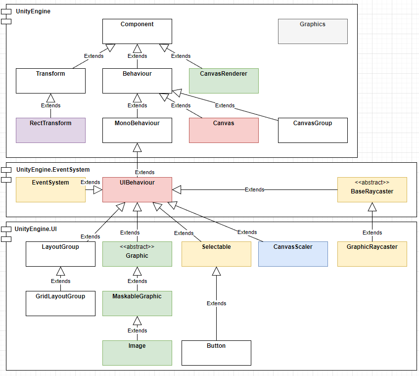 아래와 같이 주요 클래스 관계도를 보면 Unity UI가 어떻게 동작하는지 대략적으로 이해 가능하다.